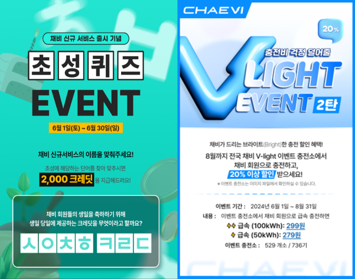 또한 지난 3월부터 5월까지 진행한 채비 V light 이벤트를 8월까지 연장한다. 일명 채비 V light 이벤트 2탄으로 6월 1일부터 8월 31일까지 전국 529개소 충전소에서 급속 충전기 736기를 대상으로 진행하며, 채비 회원으로 인증 시 100kW 이상 충전기는 기존 대비 20% 이상 할인된 299원/kWh, 50kW 충전기 역시 279원/kWh의 할인 요금이 적용된다.