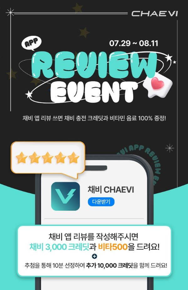 금번 이벤트는 채비 공식 모바일 앱을 다운로드한 채비 회원을 대상으로 8월 11일까지 앱 리뷰 이벤트를 진행한다. 이벤트 참여를 위해서는 구글플레이 및 앱스토어에 접속해 채비 앱에 대한 평점과 리뷰를 남긴 후 해당 작성 리뷰 화면을 캡쳐해 인증 구글폼에 첨부하면 된다.