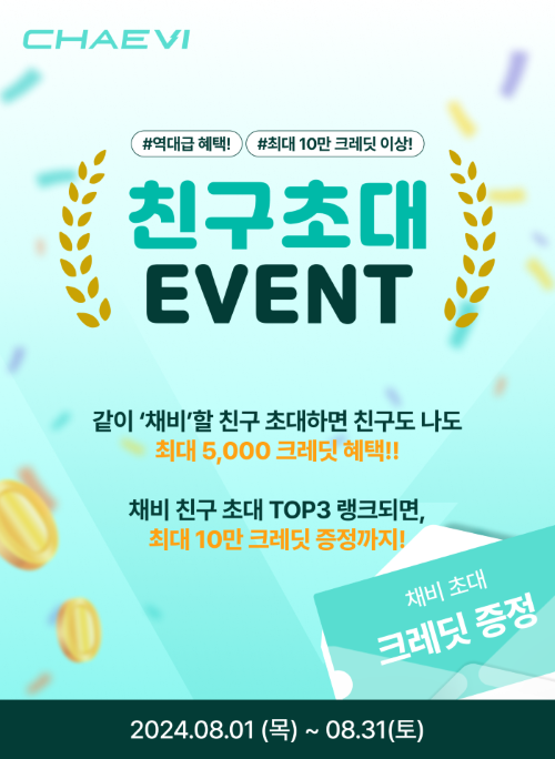 또한 7월부터 진행 중인 친구초대 랭킹전 이벤트를 통해 이벤트 기간 내 가장 많은 친구를 초대한 TOP 3 회원에게는 7월 이벤트보다 10배 커진 혜택으로 1등 100,000, 2등 50,000 및 3등 30,000 크레딧을 추가로 지급한다. 랭킹은 채비 앱을 통해 실시간으로 확인할 수 있으며, TOP3가 초대한 친구 수와 내가 초대한 친구 수 및 등수 등을 제공한다