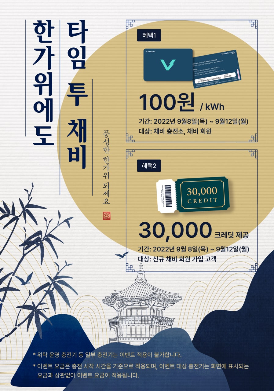 전기차 충전 브랜드 ‘채비(CHAEVI)’가 올 추석 연휴 기간 ‘한가위에도 타임 투 채비’ 고객 감사 이벤트를 실시한다.