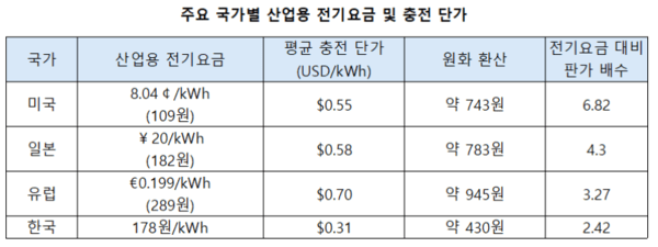 ▲ 주요 국가별 산업용 전기요금 및 충전 단가 (자료=증권신고서)