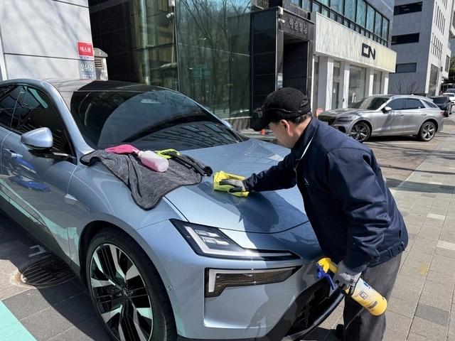 ▲ 채비스테이 강남서초센터의 직원이 충전 중인 전기차를 손세차하고 있다. 임주희 기자