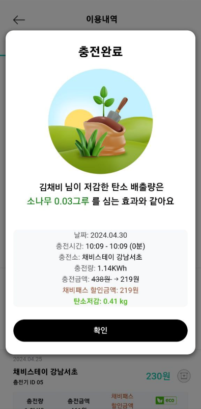 • 앱 내 표기된 충전량에 따른 탄소 저감량 및 나무 식재 효과는 관련 로직에 따라 임의 산출한 데이터이며, 실제와 상이할 수 있습니다.