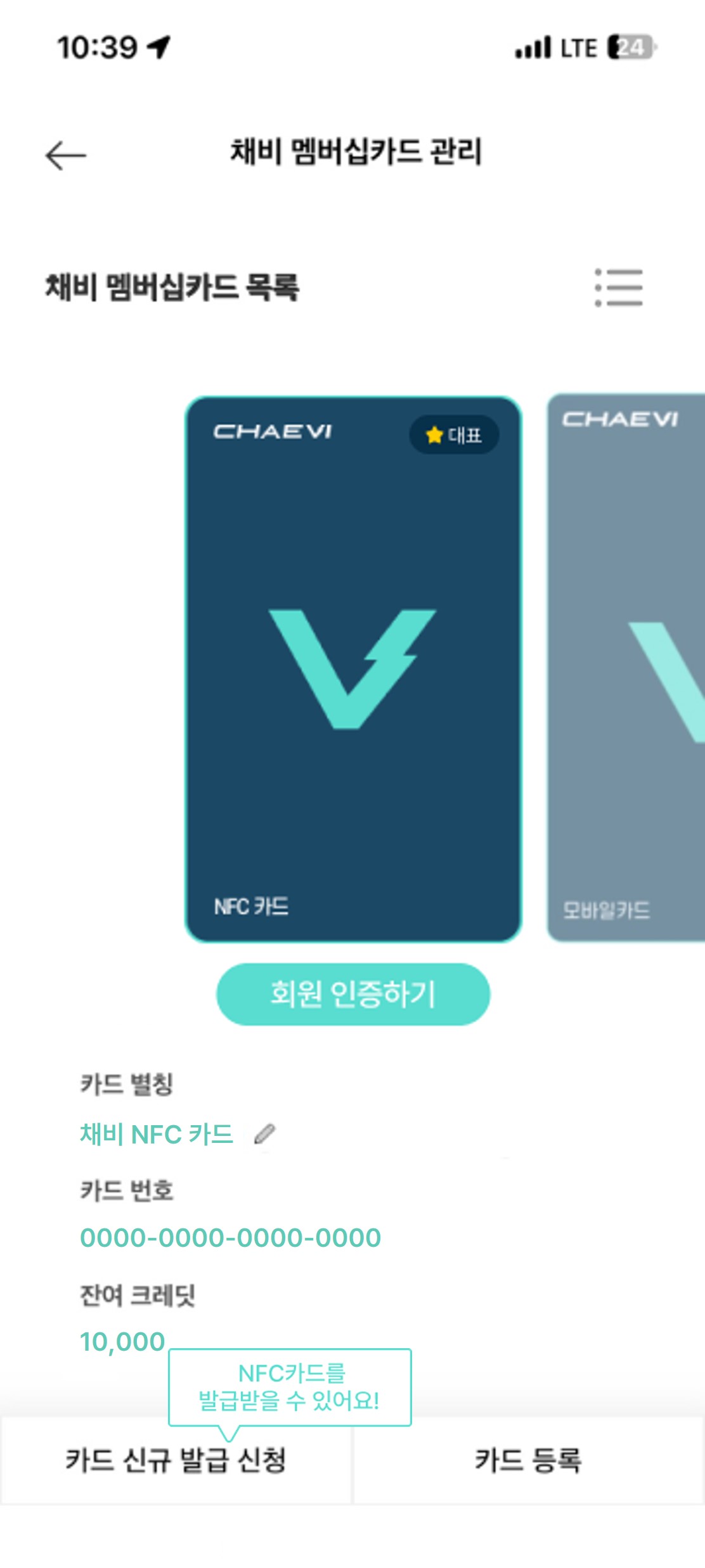 ※ 현재 실물카드를 보유하고 계신다면, 앱에서 해당 카드를 선택한 후 NFC 카드로 등록하여 사용하실 수 있습니다.(채비 앱 > MY채비 > [채비 멤버십카드 관리] > 해당 카드 선택 > NFC등록하기)